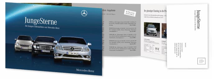 We worked on the visual direction and expansion of the new marketing concept, developement of the star-stream, the stage and the background for the cars. Following the existing Daimler brand guidelines, I designed flyer, folder, brochure, adverts, flags, banner and merchandising article in the style of the new sales strategy.