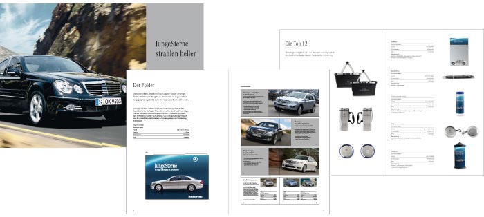 We worked on the visual direction and expansion of the new marketing concept, developement of the star-stream, the stage and the background for the cars. Following the existing Daimler brand guidelines, I designed flyer, folder, brochure, adverts, flags, banner and merchandising article in the style of the new sales strategy.
