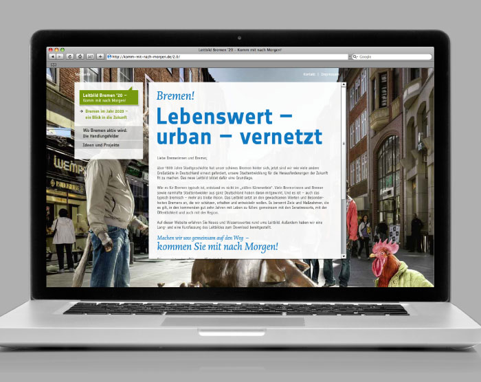“Bremen ’20” is a urban developement project, initiated by the city of Bremen. Several annual objectives should be reached for the year 2020 and the citizens of Bremen should be integrated into the running process.